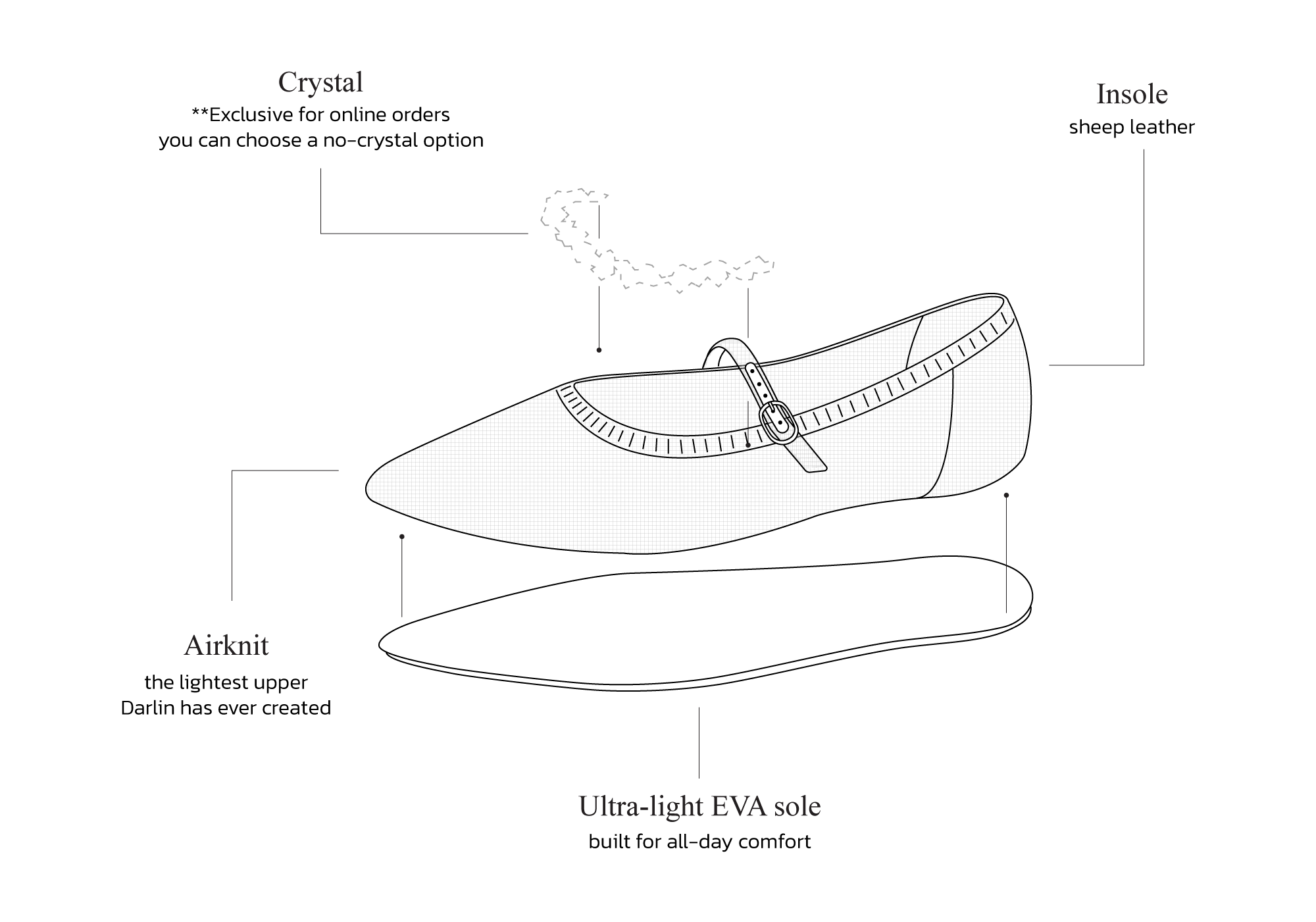 วัสดุใหม่ Airknit เทคโนโลยีการทอเส้นด้ายรูปแบบใหม่ที่ “ น้ำหนักเบาที่สุด ” เท่าที่ดารินเคยทำมาและ สายคาดหน้าเท้ารูปแบบเข็มขัด สามารถปรับได้ถึง 3 ระดับ เพื่อให้กระชับพอดีกับสรีระเท้าของผู้สวมใส่
